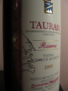 Dopo aver sbagliato un po’ di strade, finalmente siamo approdati alla cantina di Salvatore Molettieri. Conoscevo il produttore solo di fama, non avevo mai avuto il piacere di incontrarlo di persona. Devo dire che è stata una rivelazione: il Signor Molettieri è una persona squisita, un autentico “Vigneron” nel senso più nobile del termine. Un produttore del suo calibro, che colleziona importanti premi e riconoscimenti in Italia e nel mondo, avrebbe potuto benissimo liquidarci con poche parole di circostanza, ed invece ci ha dedicato oltre due ore del suo tempo. Ci ha fatto assaggiare quasi tutti i vini della sua produzione, perfino il prezioso Taurasi Riserva Vigna Cinque Querce; ci ha raccontato della nascita dell’azienda, del difficile lavoro in vigna, dell’andamento delle diverse annate (è incredibile come ricordi con precisione le date delle gelate, delle grandinate, dei temporali anche di molti anni fa). Ci ha fatto visitare tutta la cantina, compresi i nuovi locali ancora in fase di allestimento. Abbiamo ripercorso le varie tappe dei suoi successi, dei premi conquistati. Credo di aver imparato di più su che cosa significa fare il vino in quelle due ore trascorse insieme al Signor Molettieri, che in tanti anni di letture, visite in azienda e degustazioni. Siamo andati via dopo aver acquistato una bottiglia di Taurasi Riserva Vigna Cinque Querce 2005 che il nostro ospite ha ulteriormente impreziosito autografandola per noi. Ricorderò a lungo questo piacevole incontro.